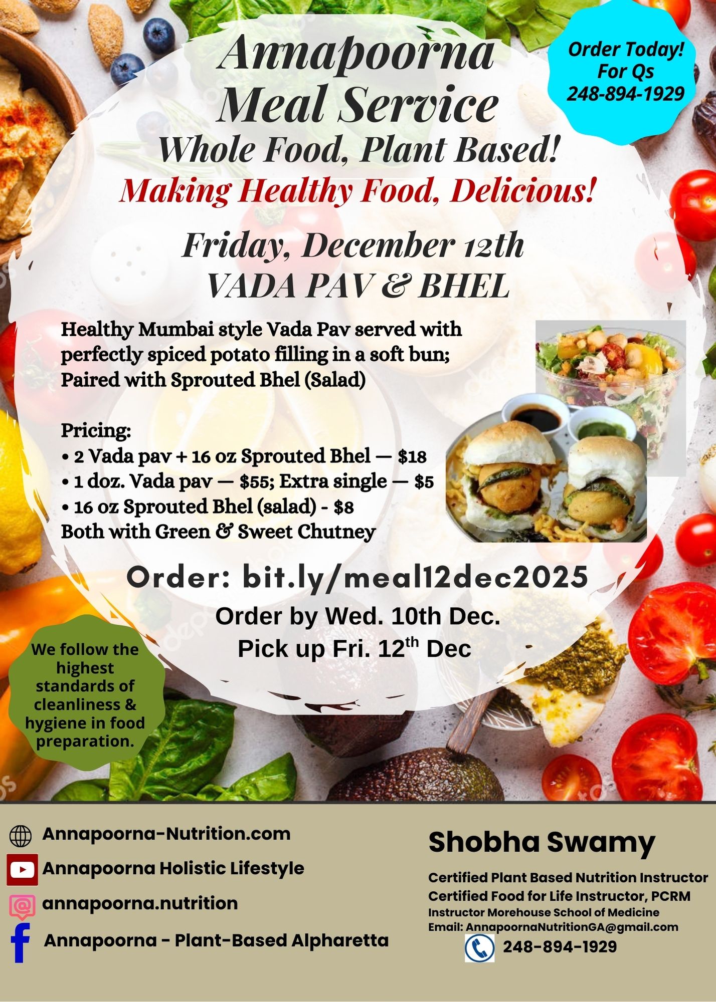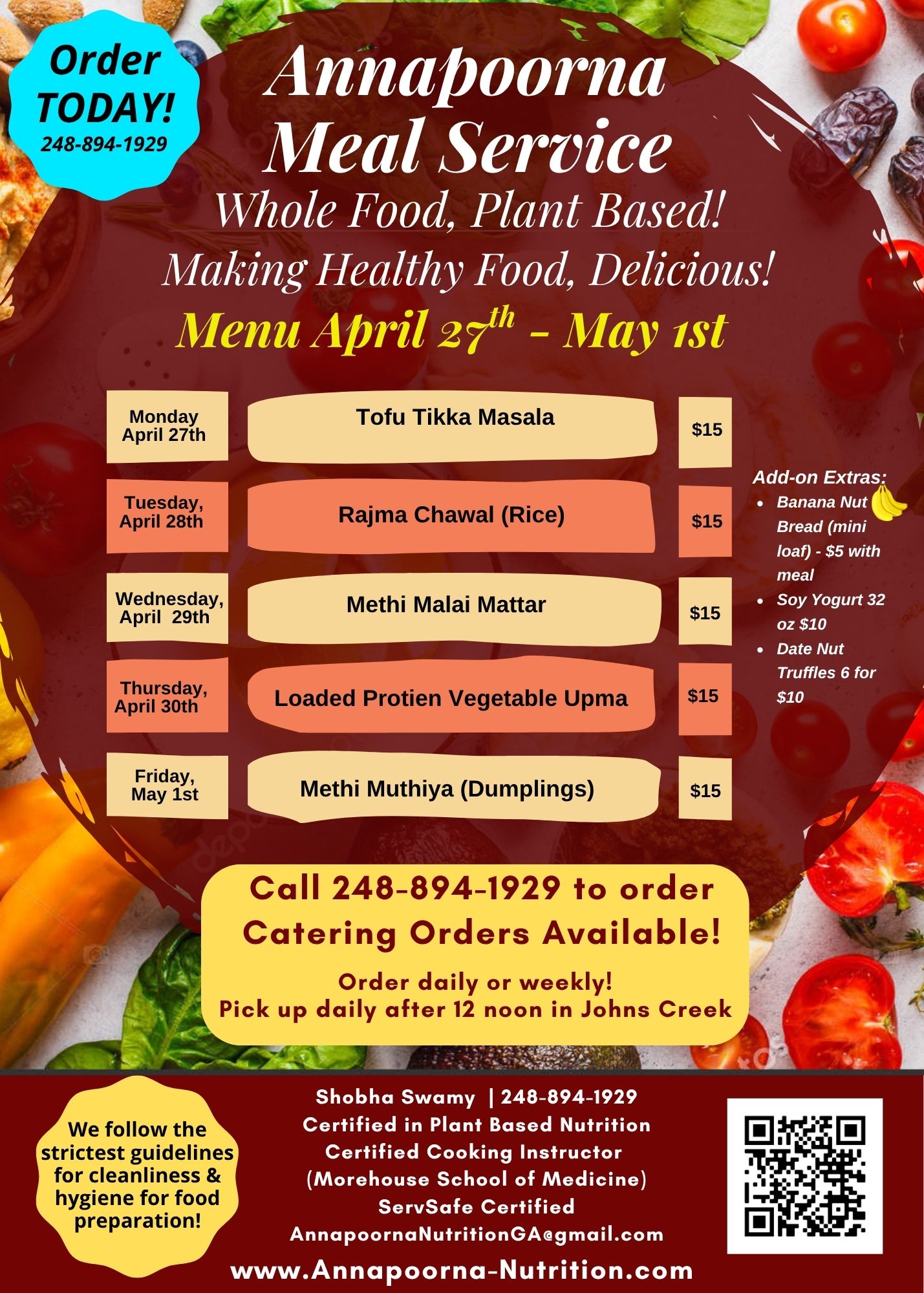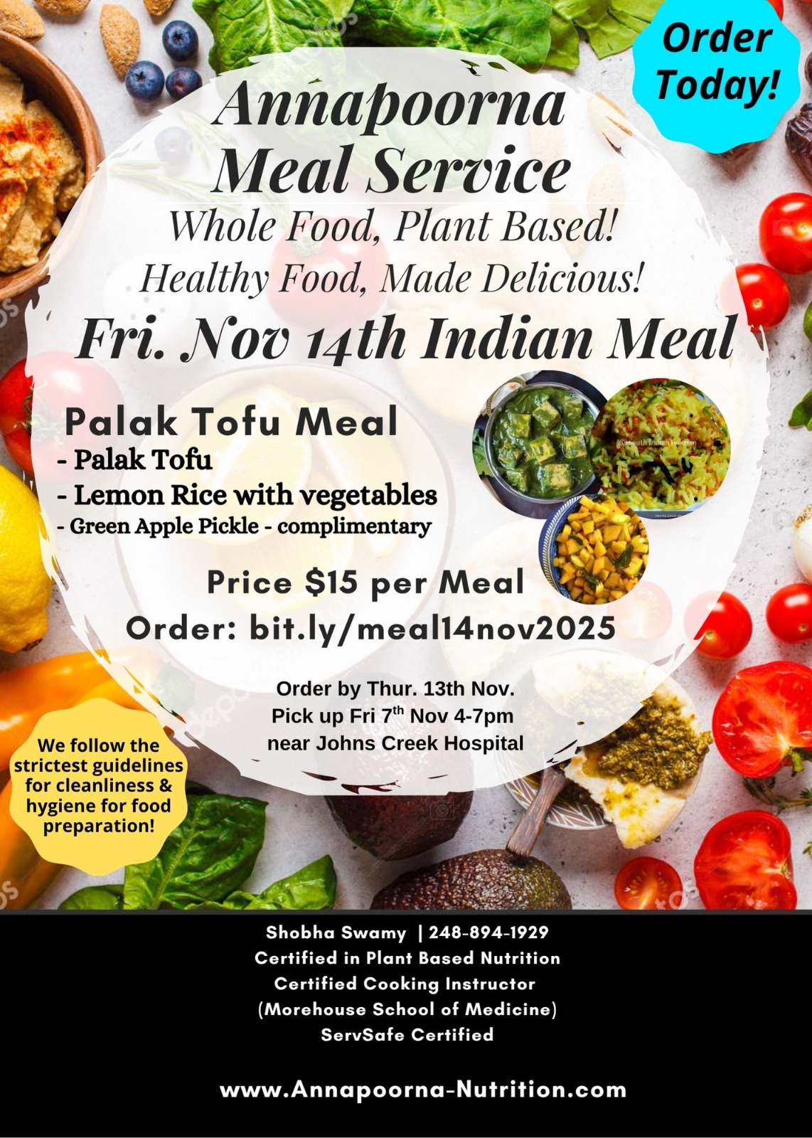 Our meal service is professionally cooked in a licensed commercial kitchen, and 100% whole food plant based. We provide you with delicious, nutritionally complete meals with uncompromising flavor. The service is primarily Indian cuisine, but also includes a wide range of other cuisines, including Mexican, Italian, Thai, Middleastern, American and others! Typical meals include vegetables and curries,, unpolished rice/millet/wheat and millet rotis, and come complete with salads, salad dressings, and dips and chutneys. We even include baked snacks, crackers, pakoda, vada pav, mixture, desserts, muffins, breads, cakes, and other delicacies!