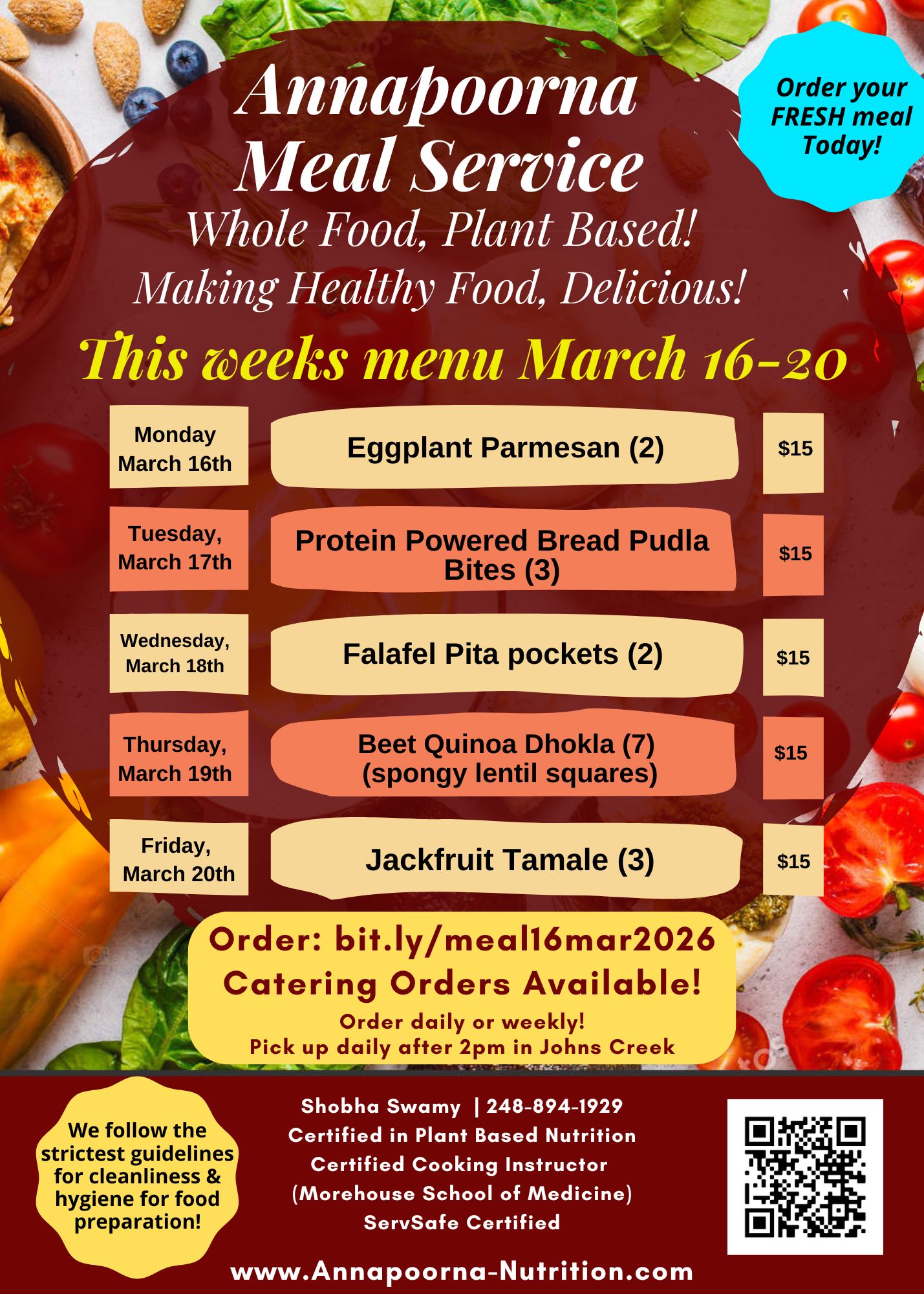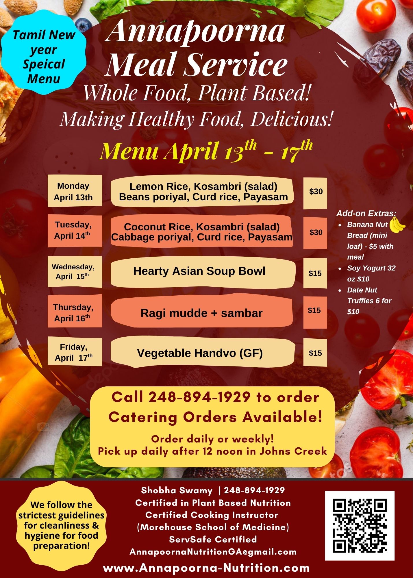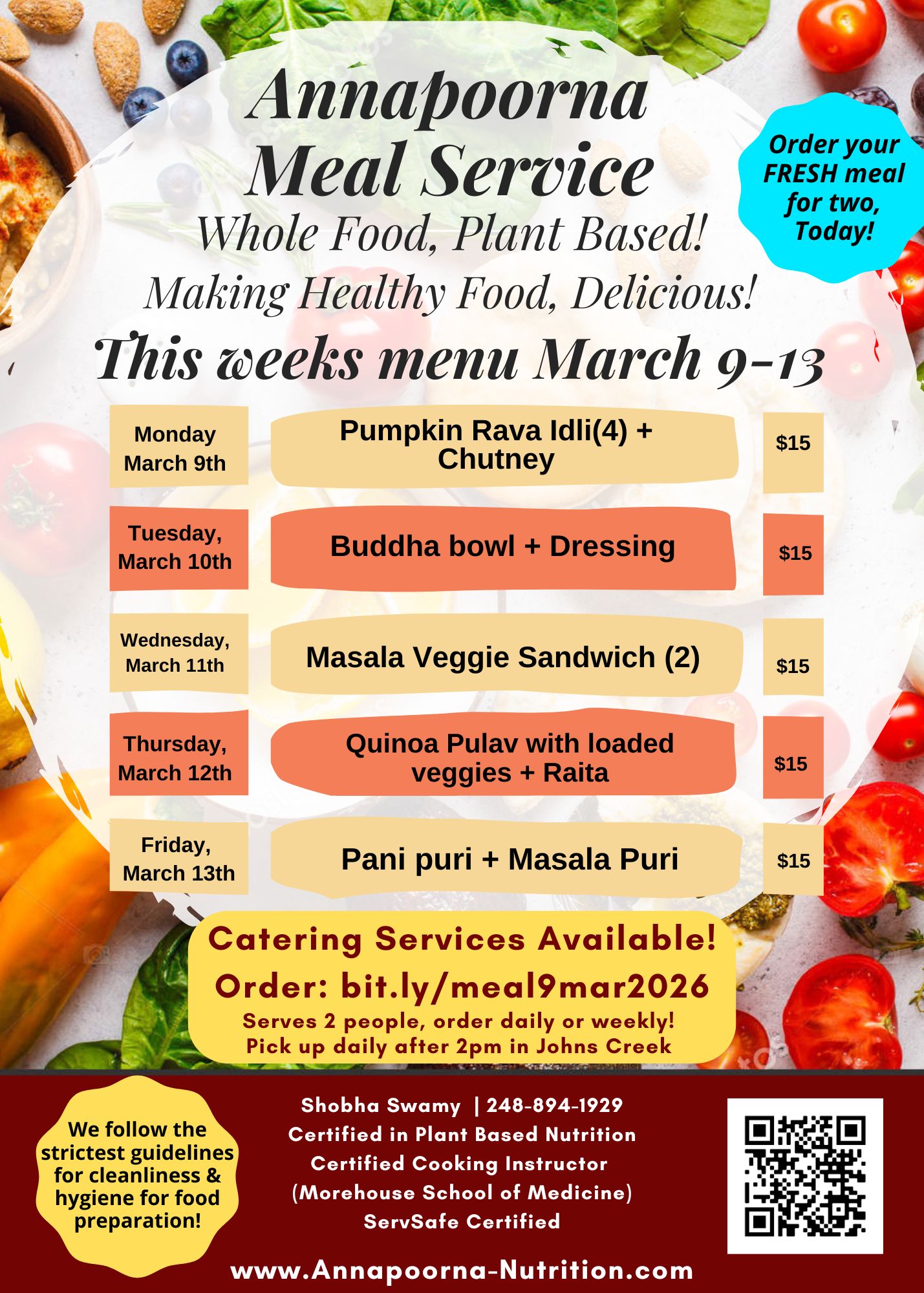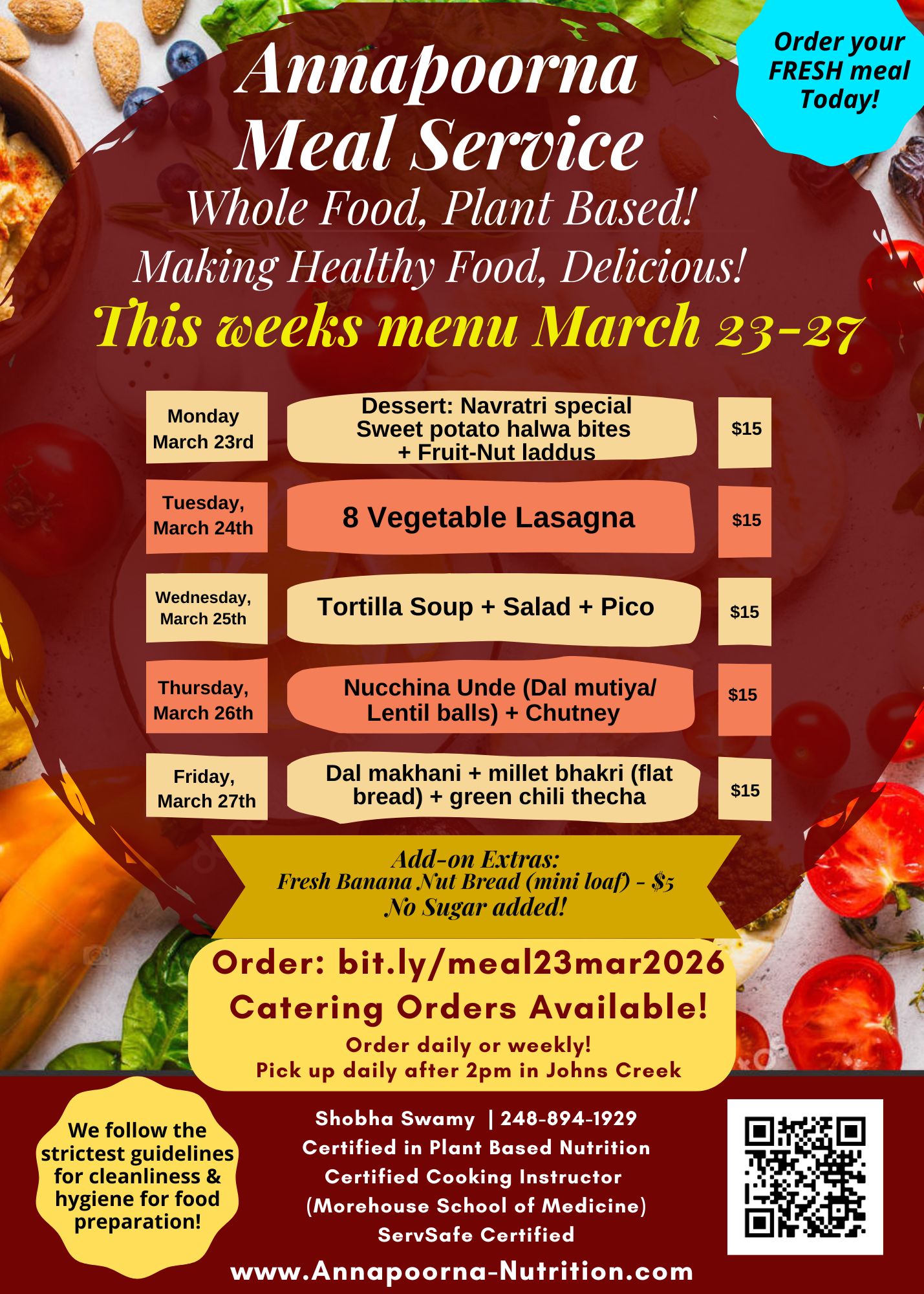Our meal service is professionally cooked in a licensed commercial kitchen, and 100% whole food plant based. We provide you with delicious, nutritionally complete meals with uncompromising flavor. The service is primarily Indian cuisine, but also includes a wide range of other cuisines, including Mexican, Italian, Thai, Middleastern, American and others! Typical meals include vegetables and curries,, unpolished rice/millet/wheat and millet rotis, and come complete with salads, salad dressings, and dips and chutneys. We even include baked snacks, crackers, pakoda, vada pav, mixture, desserts, muffins, breads, cakes, and other delicacies!