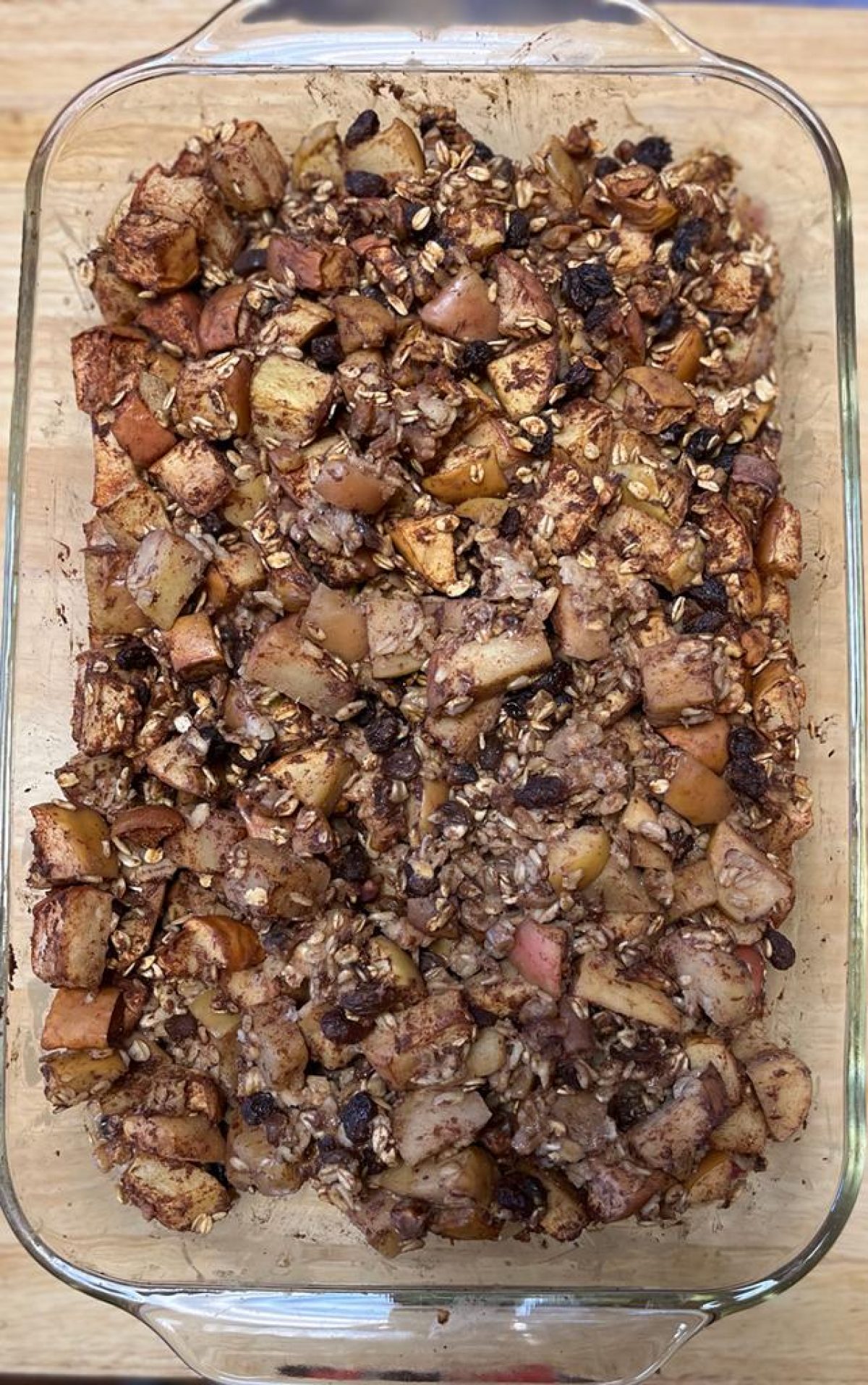 - In a baking pan add the dry ingredients and mix well. Add the chopped apples and pour plant milk and vanilla over it. Mix well to combine all the ingredients.