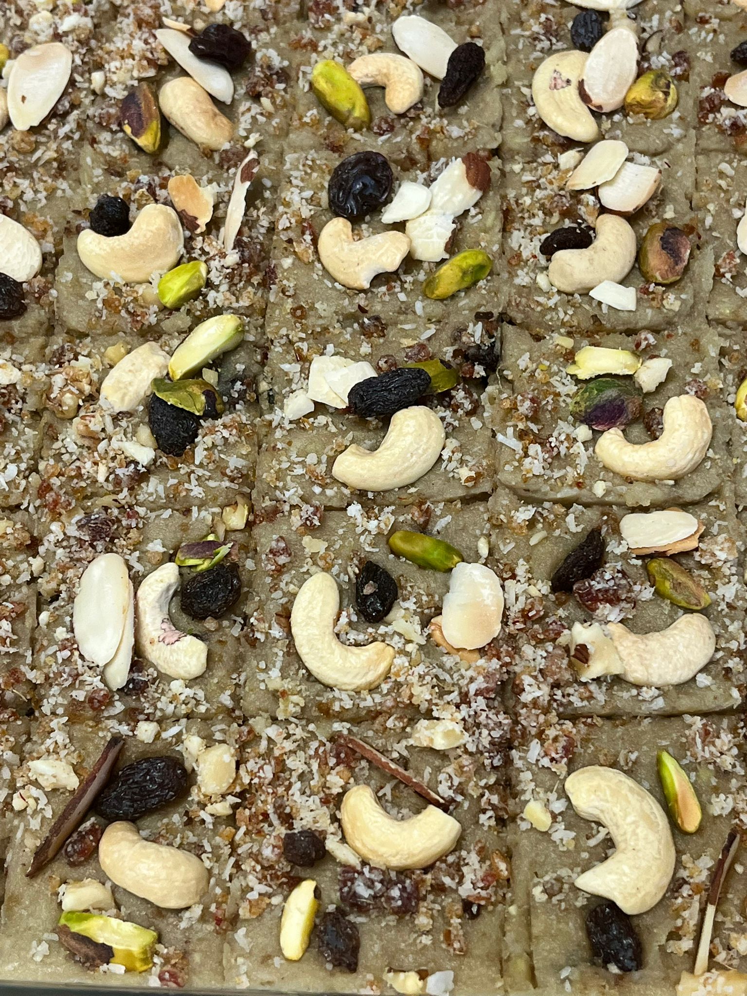 Tip: Process 4-5 mejdool dates, pits removed in a food processor with 1 tablespoon of Almond powder. Perfectly small date pieces are achieved.
