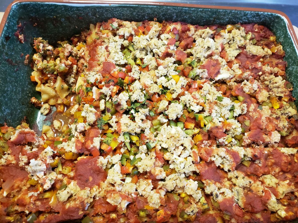 - Assembly: Use a Lasagna deep dish pan (Do not use Aluminum pans, use glass or ceramic). Layer alternate layers of tomato sauce, uncooked or no cook Lasagna noodles, with every layer of Vegetable mixture, Tofu ricotta, Bell pepper combo until tomato sauce and lasagna noodles are used up. Add 1/2 C water to the jar of tomato sauce, rinse and pour over the layers uniformly.