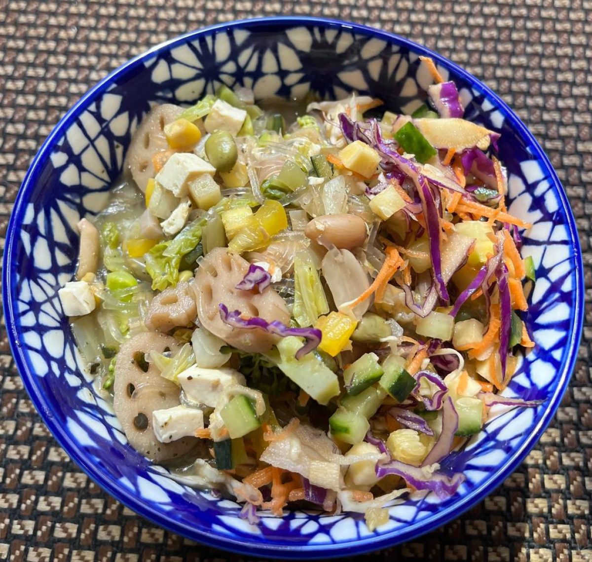 - To a pot add water, raw peanuts, lotus root edamame, corn, carrots, Napa cabbage, shredded cabbage, greens, veggies of your choice!!!