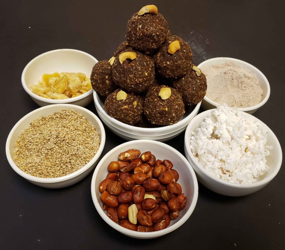 - Dry roast each ingredient except my Amma's protein powder and jaggery in a pan or toast in an oven at 300F for 20-30 mins in steps of 10 mins each until well roasted.Powder each coarsely in a blender or food processor. Be careful not to blend too fine or too much.Mix all the ingredients and pulse again in a food processor or blender.Add a few tablespoons of water or any plant based milk to make into laddus (truffles).Roll in powdered dessicated coconut. (optional)NOTE: You can substitute other nuts or seeds in place of peanuts or sesame seeds.Enjoy!