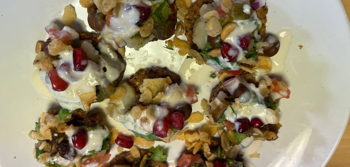 Papdi chat 1 box Mary Gone Crackers (oil free) 1 boiled potato, mashed ⅓ cup boiled black chick peas or any other beans ¼ cup onions, finely chopped ¼ cup tomatoes, finely chopped Add some toasted sunflower seeds for crunch and a few peanuts Garnish: Pomegranate seeds Arrange about 10-12 crackers in a […]