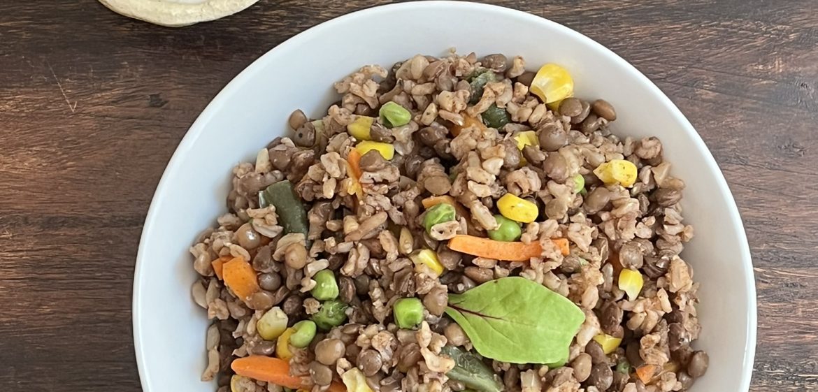Traditional Middle Eastern dish - Mujadara in Instant Pot with Tzatziki Sauce Easy one pot dish. Make often. Vary vegetables and add greens too!!!