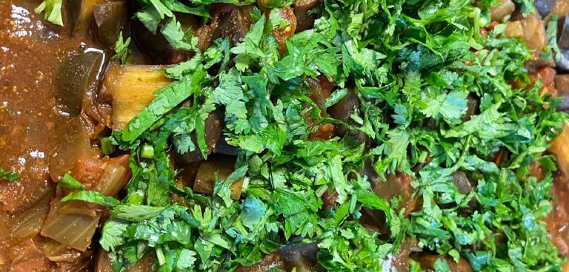 Brinjal Curry, an everyday Indian curreid dish made with eggplants, onions, tomatoes and spices