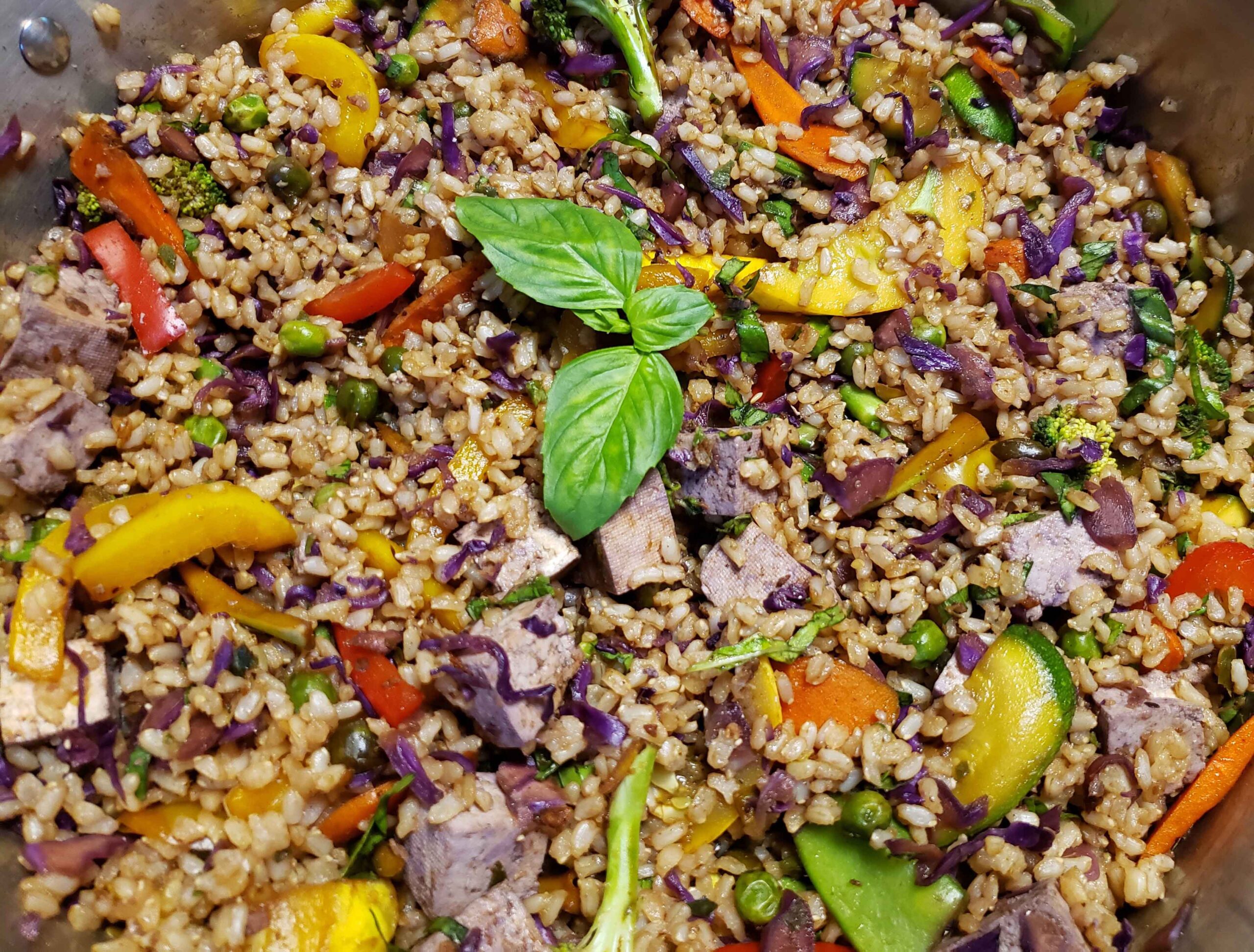 A fragrant, wholesome dish made with brown rice, fresh vegetables, and Thai basil, stir-fried without oil yet bursting with authentic spicy-sweet flavors.