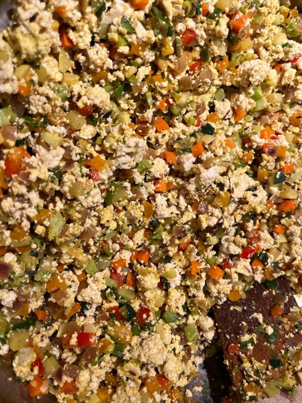 - Remove water, squeeze extra water & Crumble Extra firm Tofu. Add to Veggie mixture. Sauté for 2 mins.