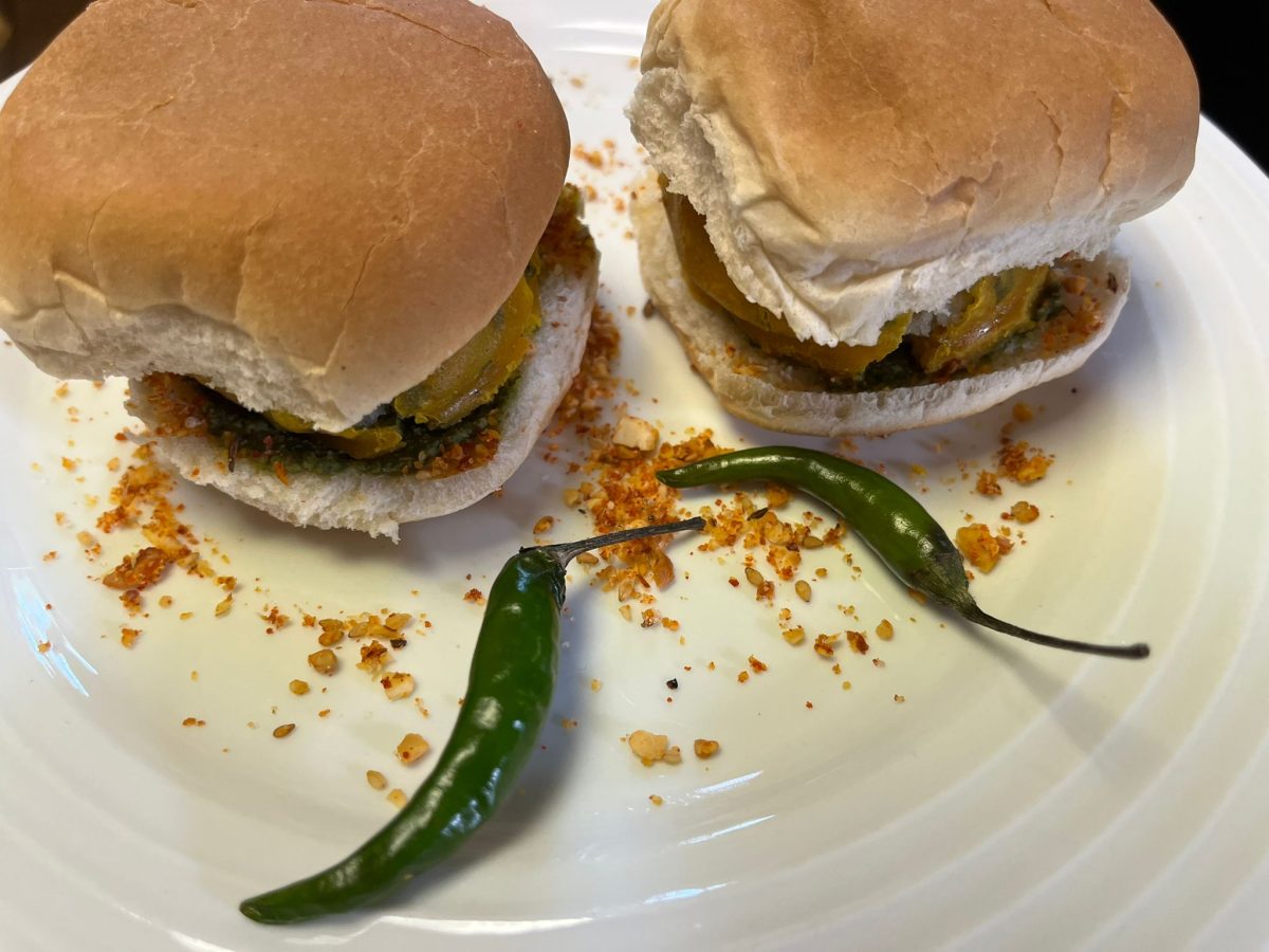 Flatten these vadas, place them between a whole wheat mini bun and add Green chutney and tamarind chutney to serve. Add Vada pav chutney powder as garnish!!!