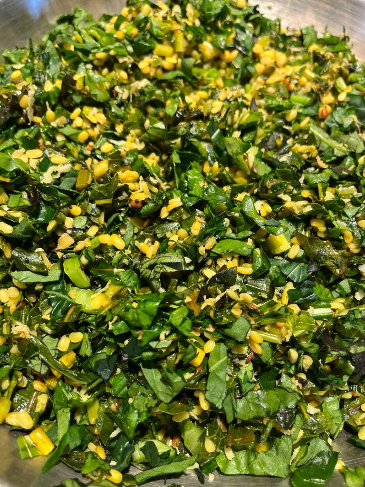 - Add greens with stems, chopped curry leaves with some salt and hing.
