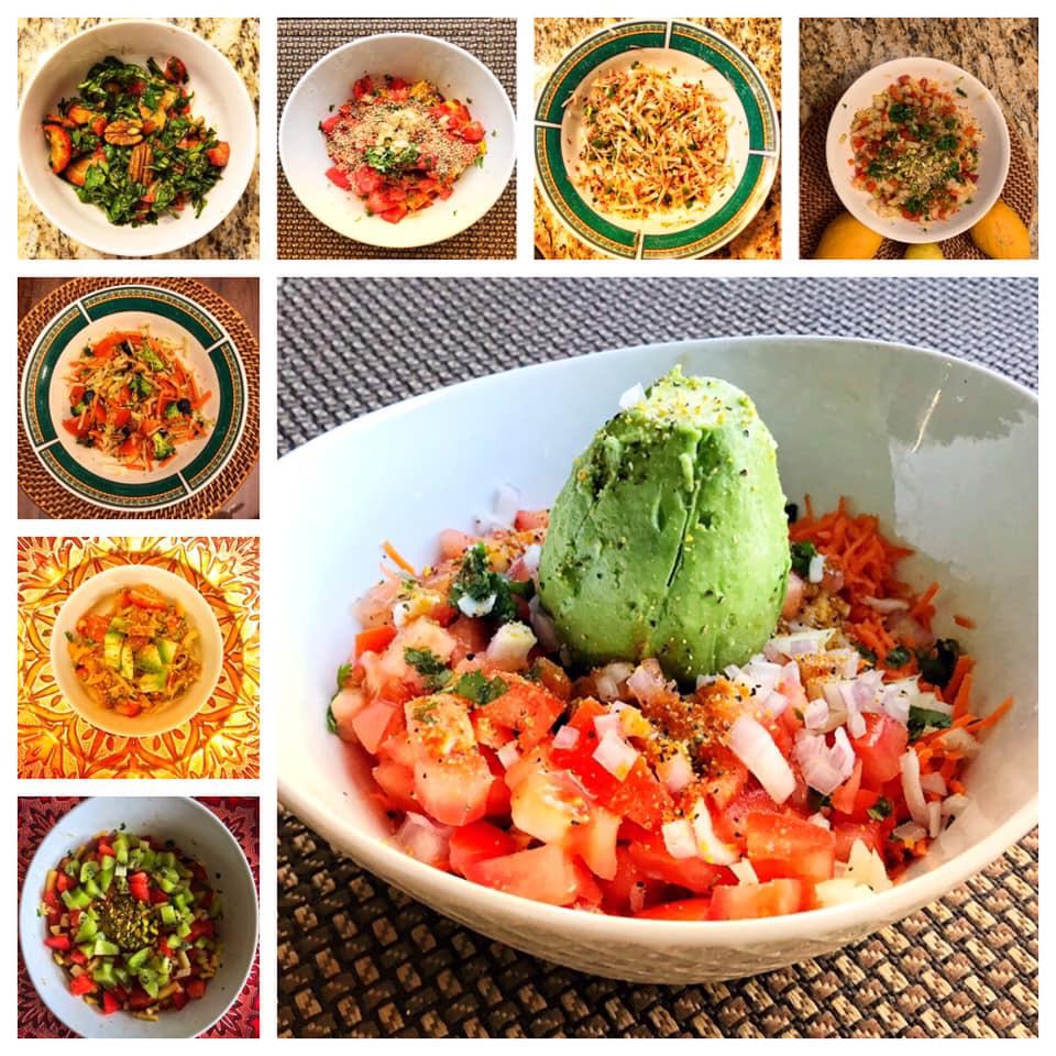 - MIX & MATCH:Step 1: 1-2 veggies(greens/cucumber/tomato/zuchini/radish/beet/papaya any fruits of your choice)Step 2: 1-2 fruits(mango/apple/strawberry/kiwi/plum/apricot/avocado etc)Step 3: Nuts(pistachio/cashew/almond/pecans/walnuts/peanuts etc) or Seeds (Hemp/Chia/pumpkin/sesame etc)+ Prebiotics (Apple cider vinegar /yeast/green chilies/Kim chee/+ any oil free dressing (lemon juice/vinegar/pickle masala etc) or fruit sauces+ garnish (coriander/parsley/mint) etc.Thanks to Gopal & Chandrika for these awesome salads!