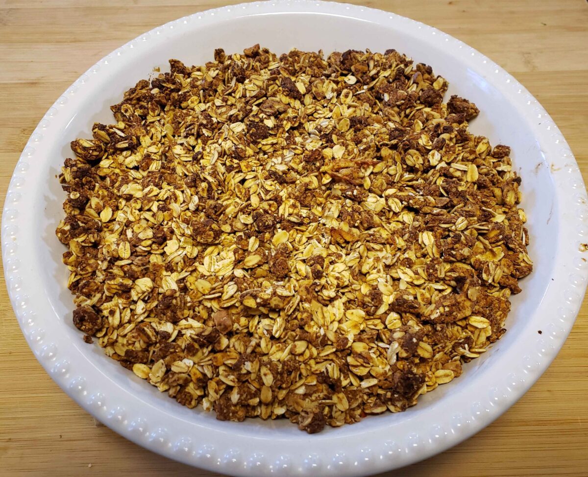 - Combine the fruit mixture and layer in a 8X8 glass, corning or ceramic baking pan or a round pie dish. Spread oat crumble mixtute evenly over the fruit mixture.